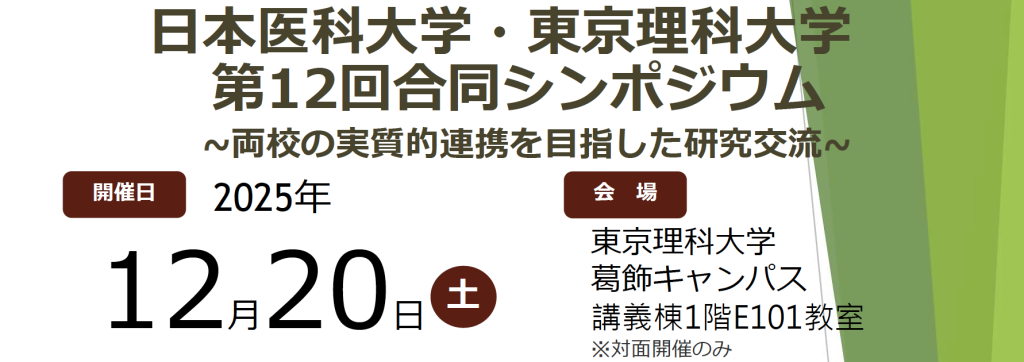 2025年12月20日(土)に東京理科大学葛飾キャンパスにおいて開催された日本医科大学・東京理科大学合同シンポジウムにおいて,10月から2ヶ月間森研究室に滞在した,久連石さんと市場君が日本医科大学の科目「科学的探究3」に関わる研究発表をしました.また,森教授が18名の日本医科大学の3年生による成果発表セッションの座長を日本医科大学付属病院長の山口博樹教授とともに担当しました.