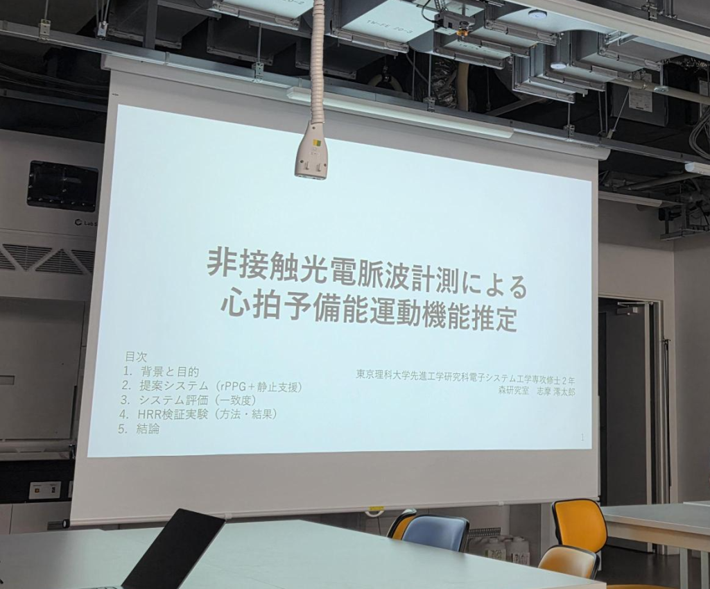 電子システム工学専攻修士課程2年の志摩君が電子システム工学専攻で機能デザイン工学科研究室に所属する学生の合同修士論文発表会で「⾮接触光電脈波計測による⼼拍予備能運動機能推定」と題する修士論文の研究の発表をいたしました.